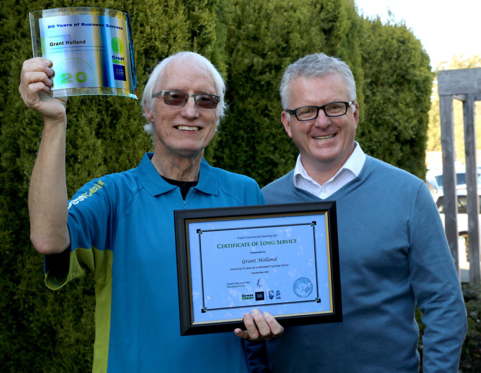 Grant Holland is the first business owner to reach the 20-year milestone, an achievement he celebrated with his Christchurch colleagues at a recent team meeting of CrestClean personnel.