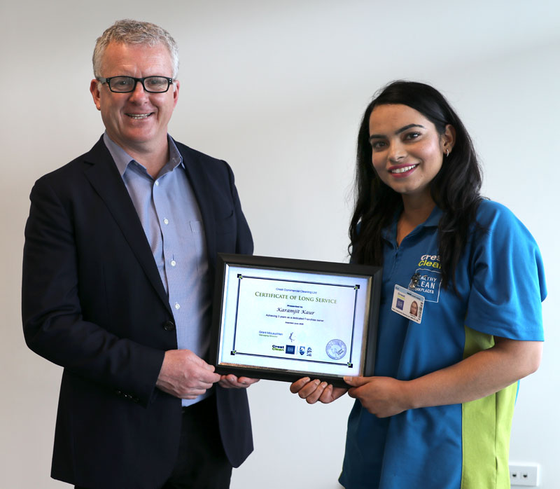 Recently Karamjit received a 3-year long service award presented by CrestClean’s Managing Director Grant McLauchlan.